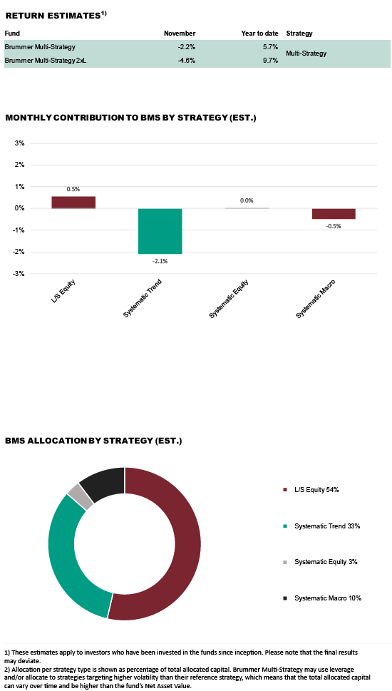 Brummer Multi-Strategy (BMS) SEK and Brummer Multi-Strategy 2xL (BMS 2xL) SEK posted an estimated return of -2.2 and -4.6 per cent respectively in November (-2.3 and -4.4 per cent for the corresponding USD classes).