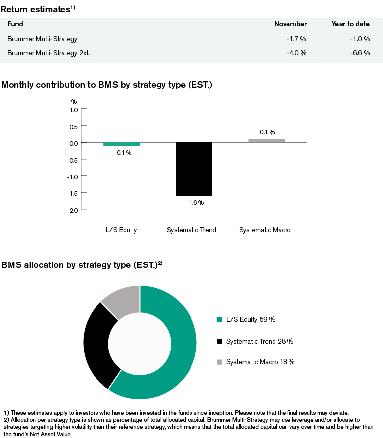 Brummer Multi-Strategy (BMS) SEK and Brummer Multi-Strategy 2xL (BMS 2xL) SEK posted an estimated return of -1.7 and -4.0 per cent respectively in November (-1.6 and -3.8 per cent for the USD classes).