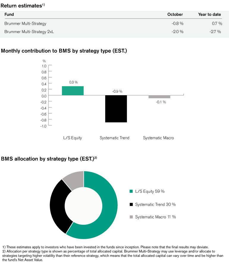 Brummer Multi-Strategy (BMS) SEK and Brummer Multi-Strategy 2xL (BMS 2xL) SEK posted an estimated return of -0.8 and -2.0 per cent respectively in October (-0.7 and -1.9 per cent for the USD classes).