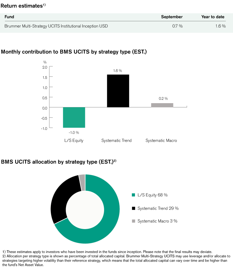 Brummer Multi-Strategy UCITS (Inst. Inception Class USD) posted an estimated return of 0.7 per cent in September.