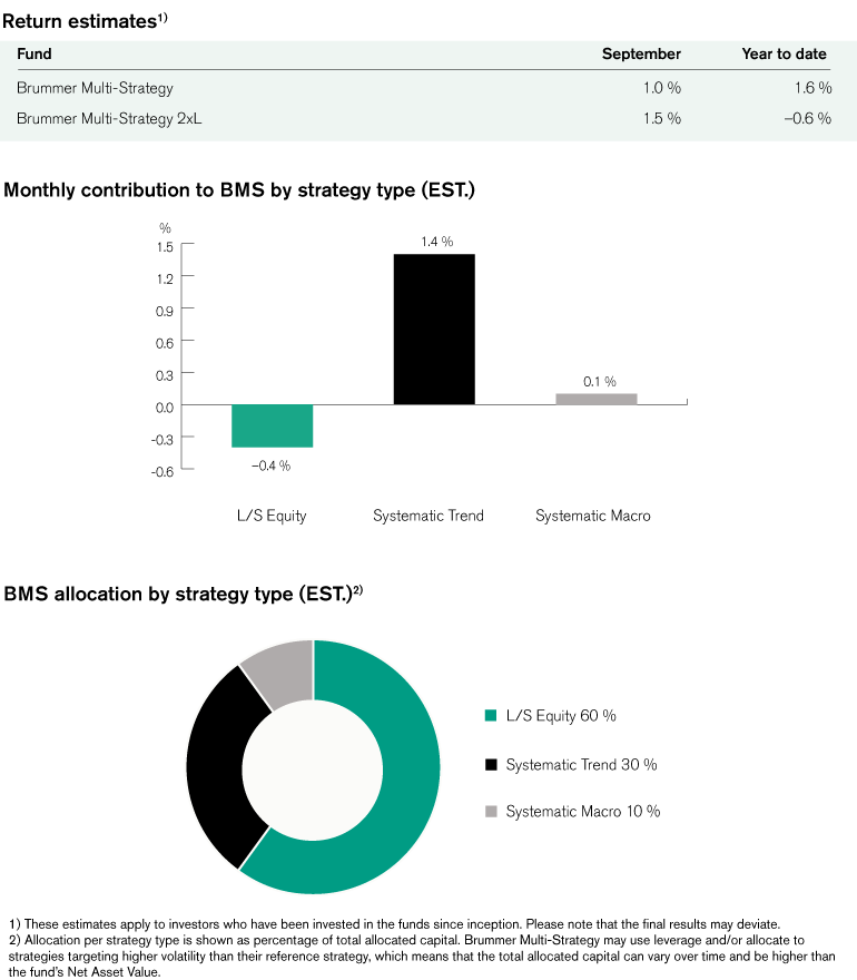 Brummer Multi-Strategy (BMS) SEK and Brummer Multi-Strategy 2xL (BMS 2xL) SEK posted an estimated return of 1.0 and 1.5 per cent respectively in September (1.1 and 1.6 per cent for the corresponding USD classes).