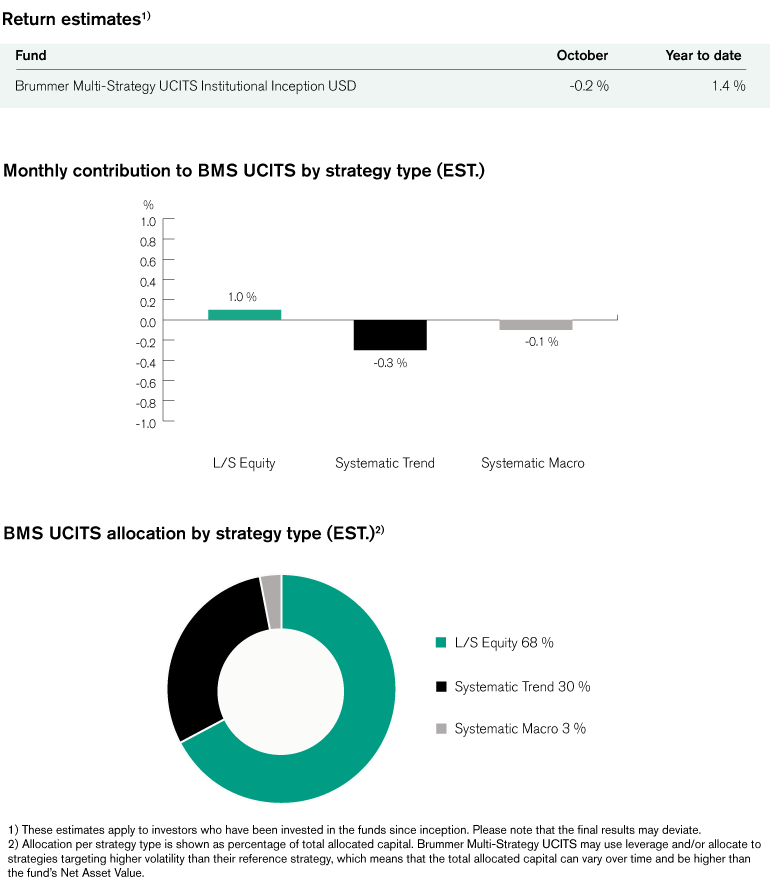 Brummer Multi-Strategy UCITS (Inst. Inception Class USD) posted an estimated return of -0.2 per cent in October.