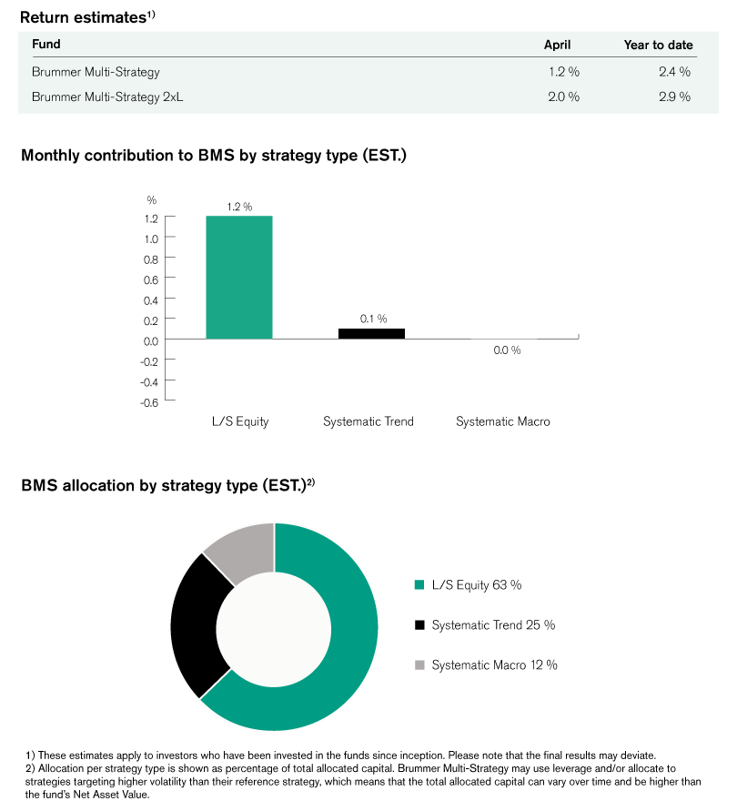 Brummer Multi-Strategy (BMS) SEK and Brummer Multi-Strategy 2xL (BMS 2xL) SEK posted an estimated return of 1.2 and 2.0 per cent respectively in April (1.4 and 3.3 per cent for the corresponding USD classes).