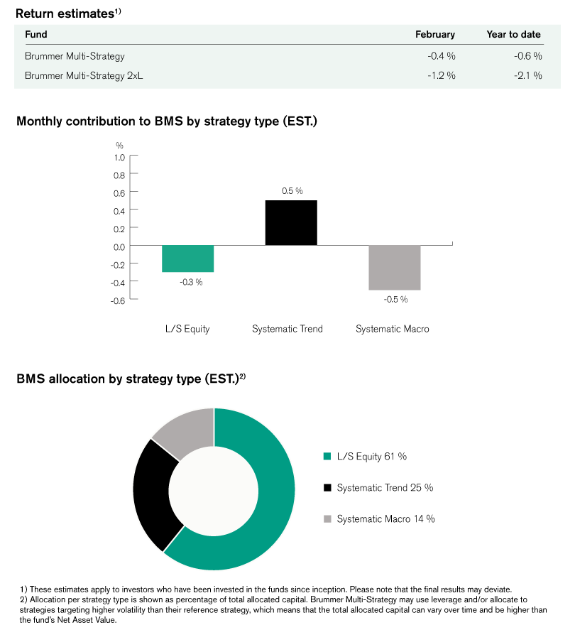 Brummer Multi-Strategy (BMS) SEK and Brummer Multi-Strategy 2xL (BMS 2xL) SEK posted an estimated return of -0.4 and -1.2 per cent respectively in February (-0.3 and -1.1 per cent for the corresponding USD classes).