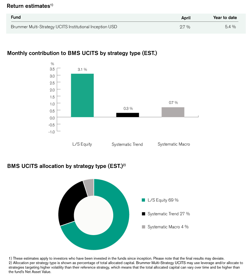 Brummer Multi-Strategy UCITS (Inst. Inception Class USD) posted an estimated return of 2.7 per cent in April.
