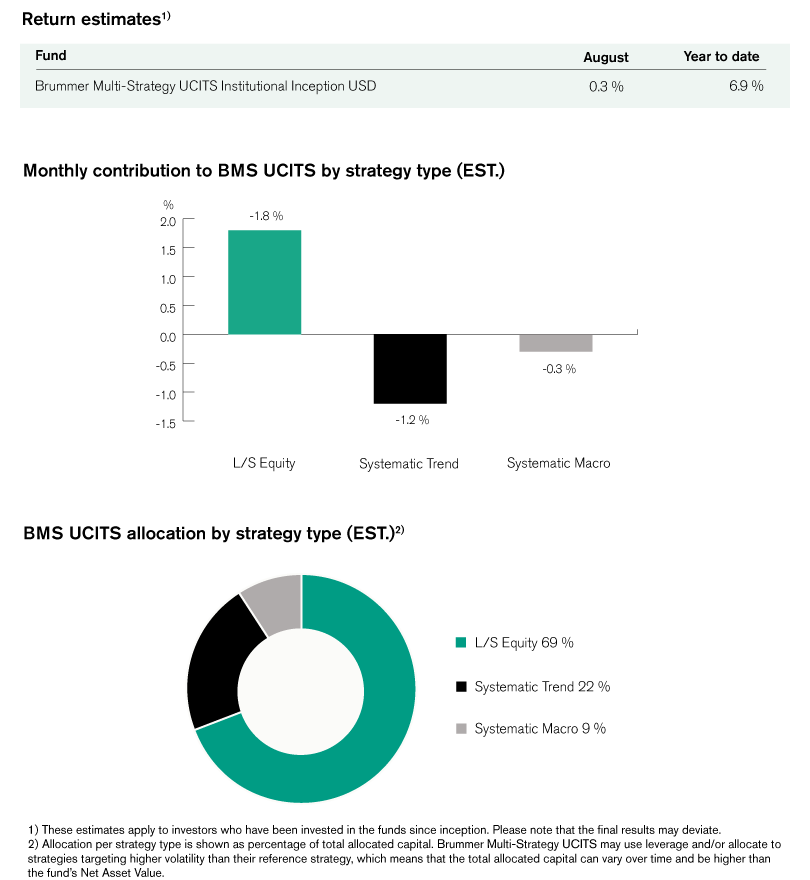Brummer Multi-Strategy UCITS (Inst. Inception Class USD) posted an estimated return of 0.3 per cent in August.