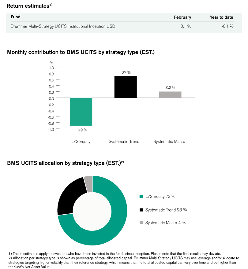 Brummer Multi-Strategy UCITS (Inst. Inception Class USD) posted an estimated return of 0.1 per cent in February.