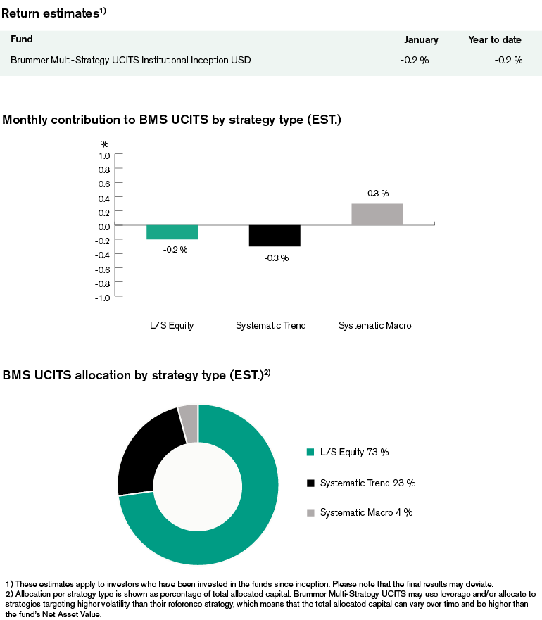 Brummer Multi-Strategy UCITS (Inst. Inception Class USD) posted an estimated return of -0.2 per cent in January.