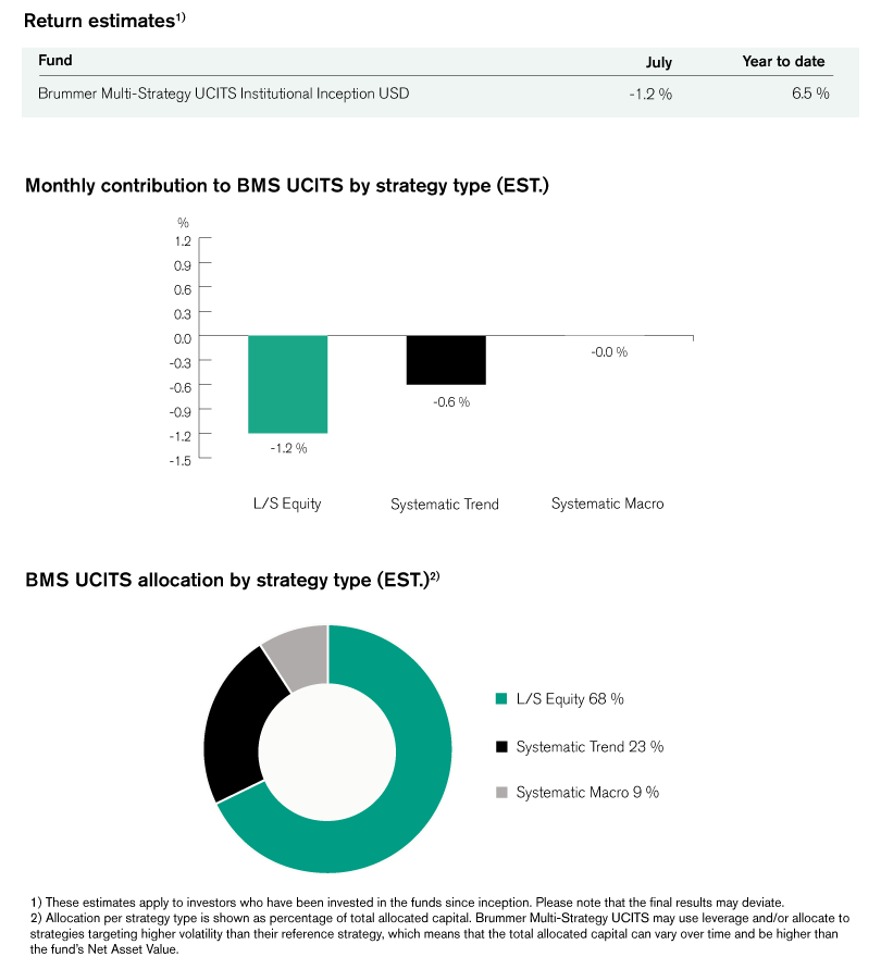 Brummer Multi-Strategy UCITS (Inst. Inception Class USD) posted an estimated return of -1.2 per cent in July bringing year to date performance to an estimated 6.5 per cent.