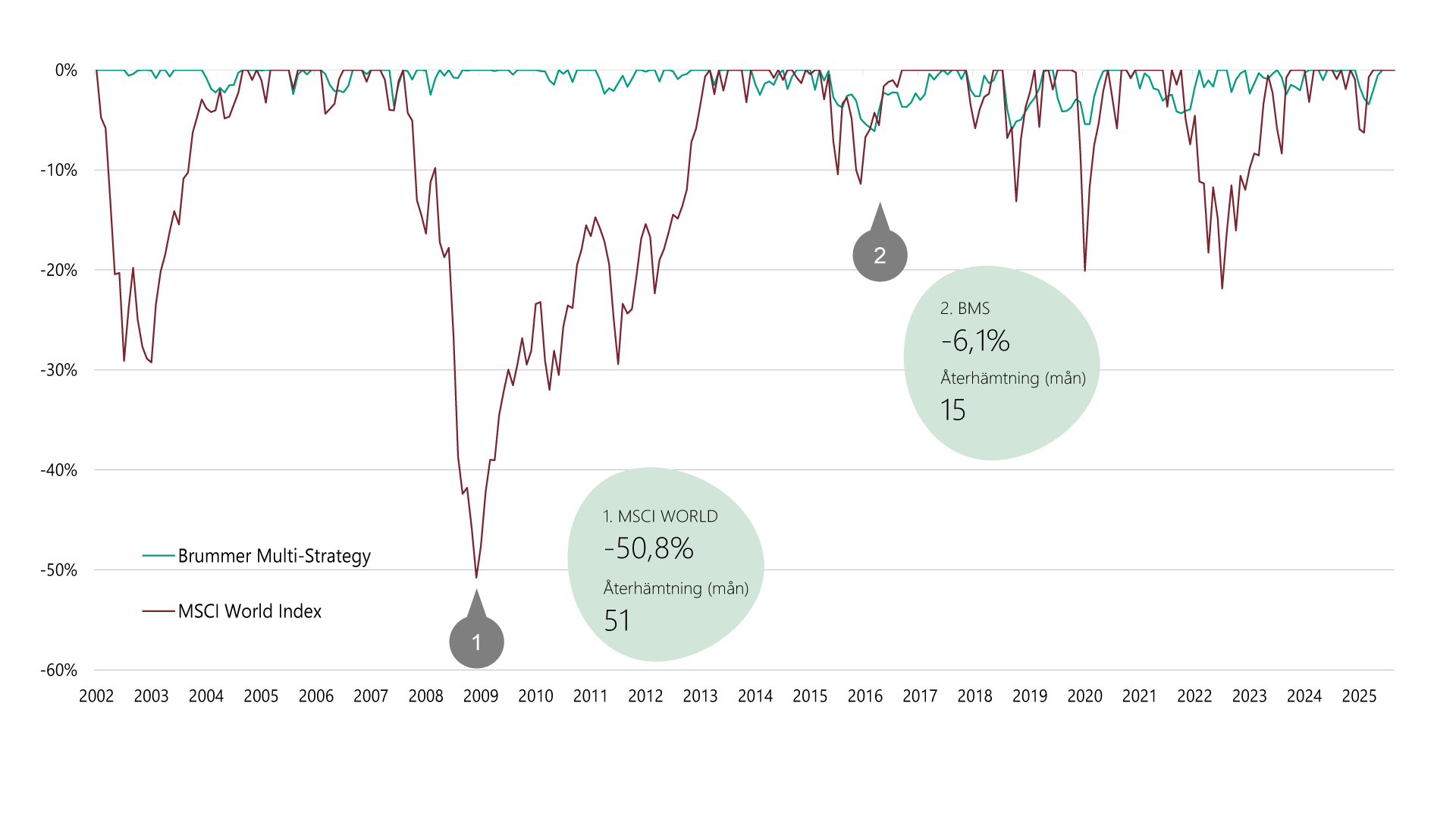 Grafen illustrerar hur Brummer Multi-Strategy historiskt har lyckats begränsa värdefallet i en portfölj och samtidigt förkorta återhämtningstiden efter större börsnedgångar.