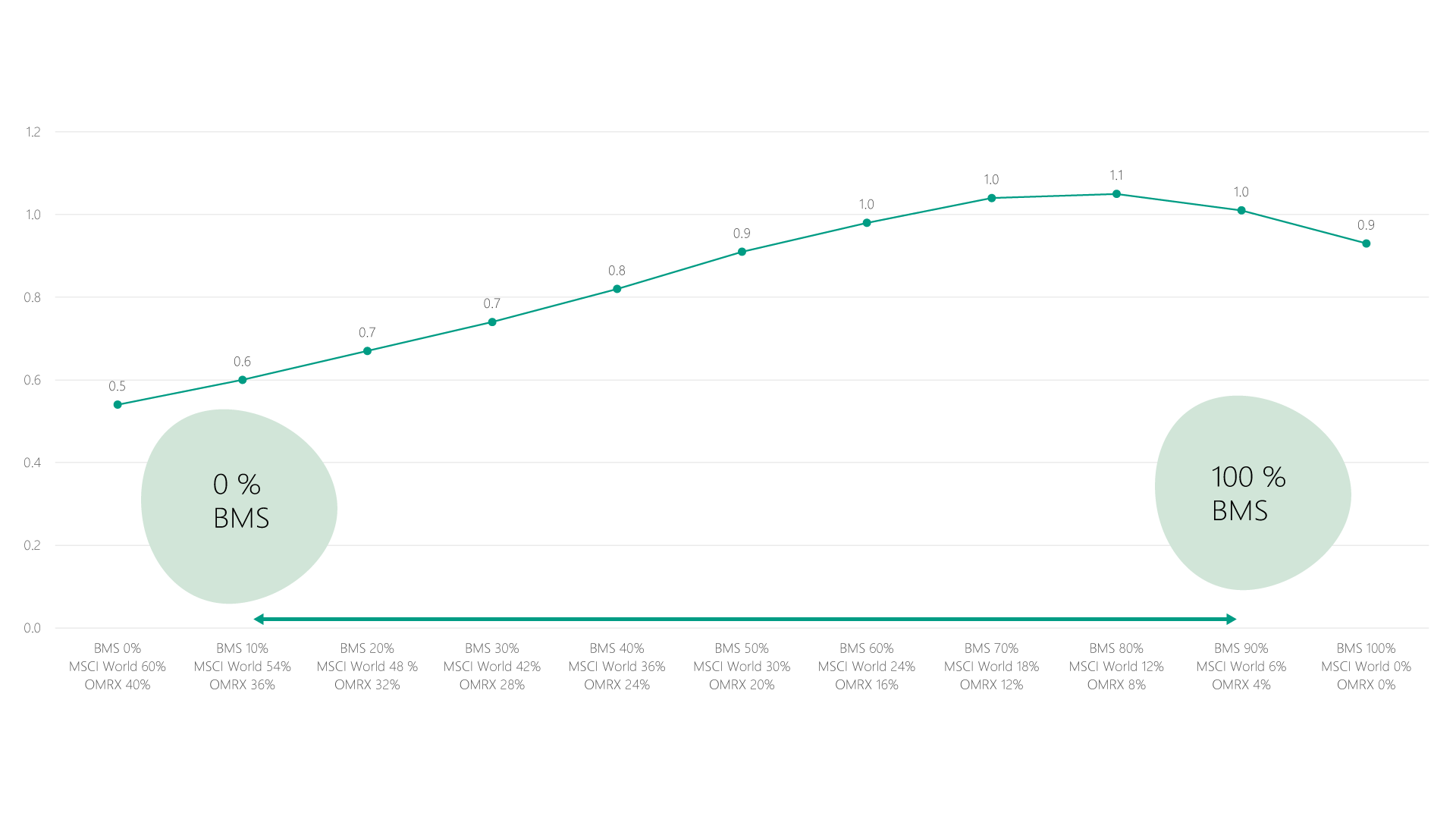 Grafen illustrerar att med BMS som del av en traditionell portfölj förbättras den riskjusterade avkastningen, mätt som Sharpe-kvot, avsevärt jämfört med en portfölj endast bestående av aktier och räntor.