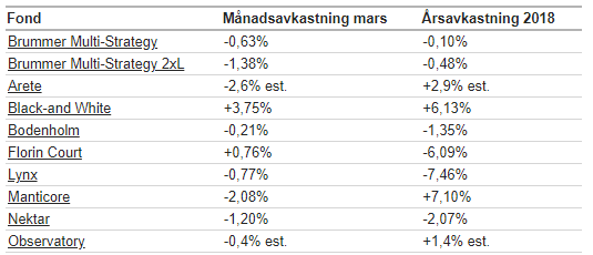 Brummer Multi-Strategy (BMS) tappade 0,6 procent i mars och avkastningen är därmed oförändrad under 2018. Hedge Fund Researchs HFRI fond-i-fond index var oförändrad under föregående månad och är upp 0,9 procent för året.