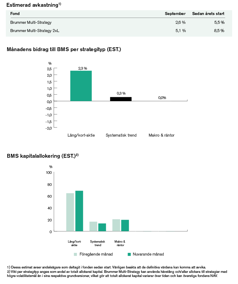 Brummer Multi-Strategy (BMS) och Brummer Multi-Strategy 2xL (BMS 2xL) genererade en estimerad avkastning på 2,6 respektive 5,1 procent i oktober.