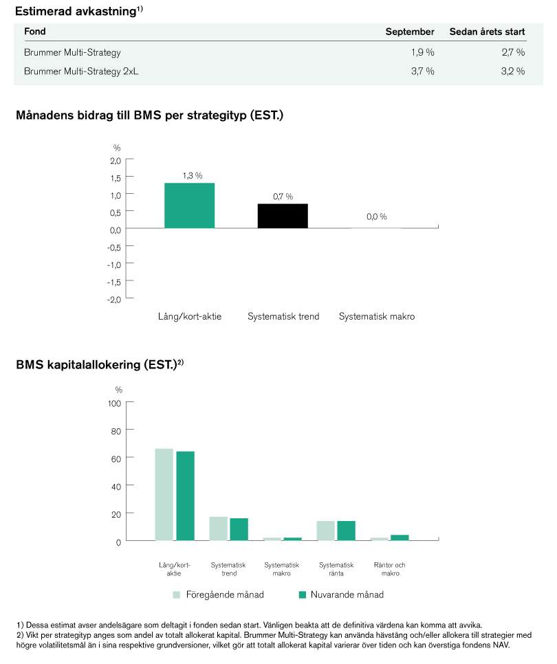 Brummer Multi-Strategy (BMS) och Brummer Multi-Strategy 2xL (BMS 2xL) genererade en estimerad avkastning på 1,9 respektive 3,7 procent i september.